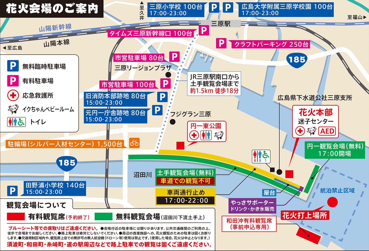 8月8日(金)、9日(土)は三原駅ロータリーと三原市街地の道路が通行止めになるため、バス乗り場が「三原駅」から「三原桟橋」変更となります。