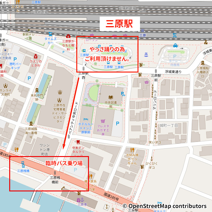 8月8日(金)、9日(土)は三原駅ロータリーと三原市街地の道路が通行止めになるため、バス乗り場が「三原駅」から「三原桟橋」変更となります。